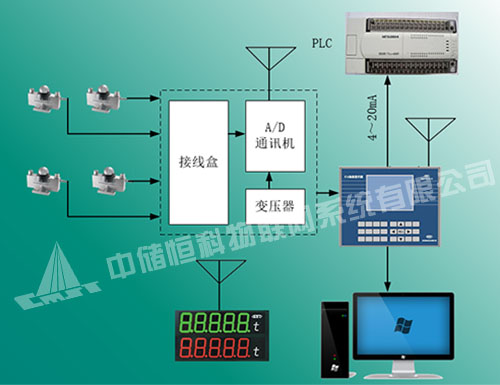 本方案與方案一的不同之處就是稱重顯示器在廢鋼車上,這樣做的好處就是數(shù)據(jù)處理速度快,系統(tǒng)簡化。對傳感器的供電可以采用平臺車上的電源。